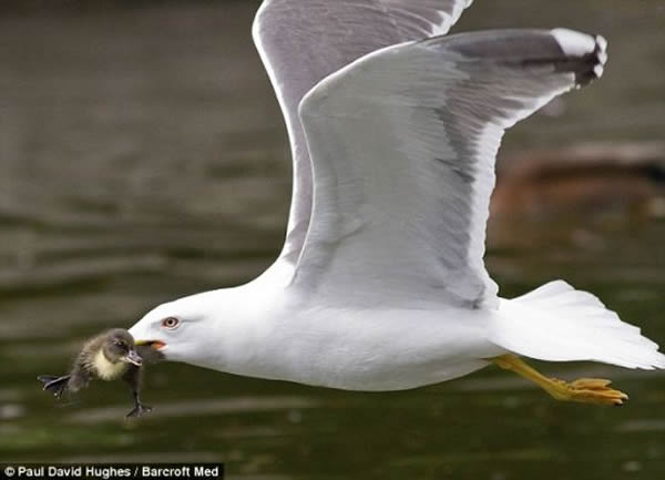 照片显示,这个鸭子大家庭成为一只饥肠辘辘、正在捕猎的海鸥的受害者。鸭爸爸和鸭妈妈当时正领着一群小鸭子去爱尔兰都柏林赫伯特公园的一个小池塘尝试第一次下水游泳。但是很快它们就与另一只鸭子发生了口角,并飞起来追赶它。一直在池塘上空盘旋的小黑背鸥此时抓住机会。它迅速俯冲下来,用嘴从水面上叼起一只小鸭子就跑。它在众目睽睽之下飞到附近一个安全的地方,并把小鸭子整个吞下肚。