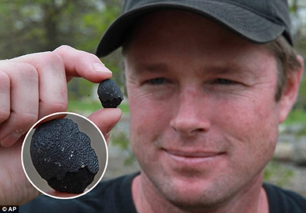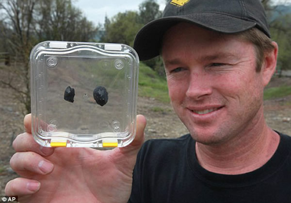 陨石猎人罗伯特•伍德(Robert Ward)20多年来一直致力于寻找不同寻常的太空石块碎片,现在他终于发现了两个小石块大小的陨石,其价值可高达黄金的10倍。这两个微小的陨石是在北加利福利亚州的塞拉利昂山麓被发现的。科学家说它们是一个巨大火流星体的一部分,这颗巨大的火流星的威力相当于二战末期投放在广岛的原子弹威力的三分之一。