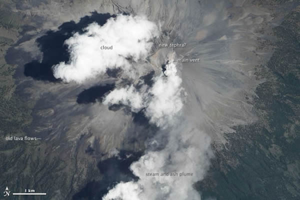 一股股蒸汽和火山灰从火山主要喷口喷出,在风的作用下向东南飘去,并在火山东北侧翼洒下炽热的岩屑。在火山西坡的森林里,还可以看见火山喷出的熔岩流。火山主喷口西北边的一团乌云遮住了部分火山烟流。