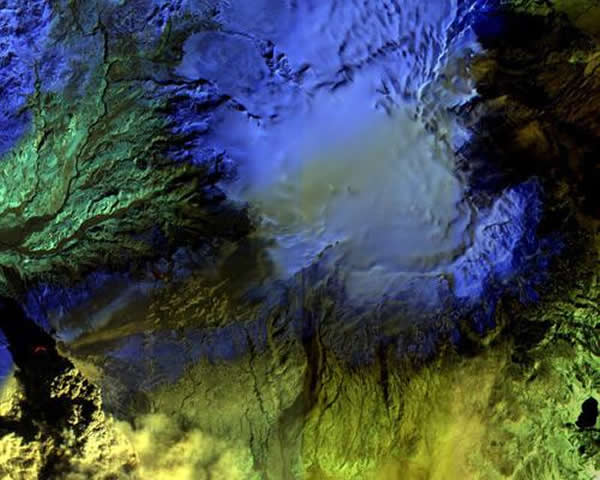 图为2010年4月17日拍摄的冰岛埃亚菲亚德拉火山((Eyjafjallaj欀甀氀氀 Volcano)。美国宇航局表示,这种假色图像显示了一种强大的热源(图片中显示红色)。该图由美国宇航局的地球观测卫星-1号(Earth Observing-1)上搭载的先进陆地成像仪(Advanced Land Imager)所拍摄。