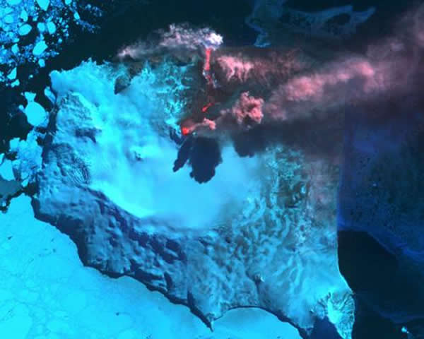 这张假色图像显示的是南桑威奇群岛的蒙塔古岛(Montagu Island)。南桑威奇群岛位于南美洲和南极洲之间。蒙塔古岛上的贝琳达山(Mount Belinda)是一个活火山,直到2001年年底,它开始喷发。这张图片由NASA利用其塔拉卫星(Terra)上搭载的高级星载热量发射及反射辐射计(Advanced Spaceborne Thermal Emission and Reflection Radiometer)在2005年9月23日拍摄。NASA描述图片:红色表示热区,蓝色表示雪,白色表示蒸汽,灰色表示火山灰。一缕缕蒸汽从炽热火山熔岩与海洋交汇处呈羽毛形向上升。