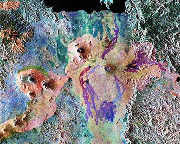 奋进号航天飞机在1994年拍摄了这张图像。图像顶部的暗区是基伍湖(Lake Kivu),该湖的右边与刚果接壤,左边与卢旺达接壤。该图像的中心显示的是尼拉贡戈火山(Nyiragongo volcano),其中央的火山口现在是一个熔岩湖。据美国宇航局称,左边是三座火山:卡里辛比火山( Mount Karisimbi),Sabinyo火山和穆哈武拉火山。尼亚穆拉吉拉火山在它们的右边。非洲濒危的山地大猩猩生活在卡里辛比火山南侧附近的竹林。
