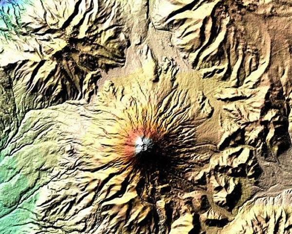 这张照片由奋进号航天飞机在2000年2月19日映射地球表面海拔时拍摄。坐落在安第斯山脉的科托帕希火山是一座频繁爆发的火山,自1738以来爆发了50次。NASA写道:“图像中的蓝色和绿色表示最低海拔,而米色、橙色、红色和白色代表了逐渐增高的海拔。科托帕希火山被称为世界上海拔最高的持续活跃的火山。