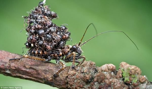 这张可怕的照片显示食虫蝽象背部至少携带着20只蚂蚁,科学家称,这种恶心恐怖的模样会让跳蛛等潜在掠食者感到困惑。