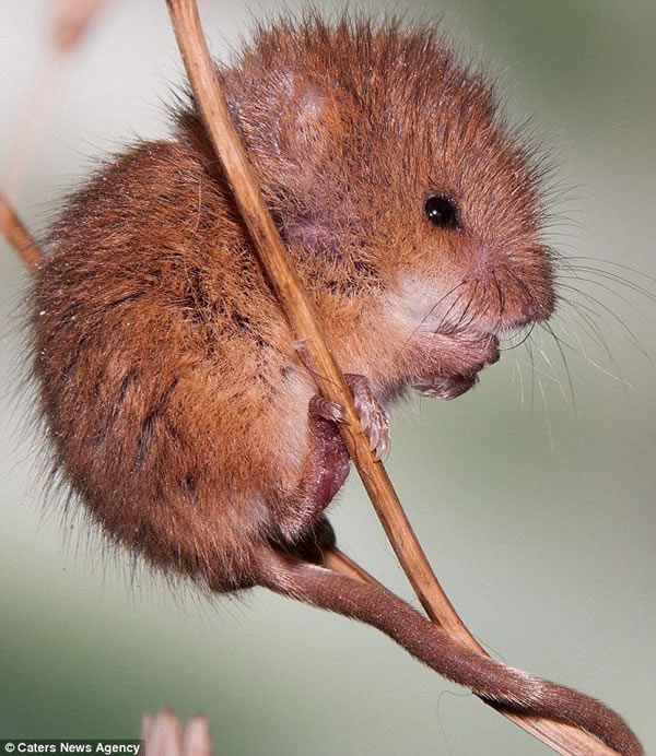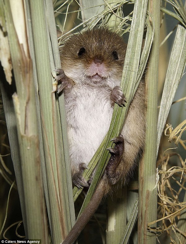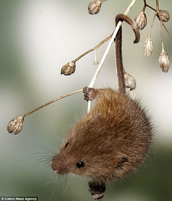 勇敢的巢鼠能够用尾巴倒悬挂在植物上,来寻找谷粒食物