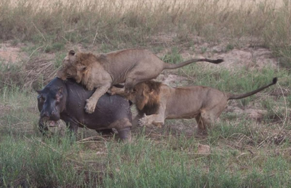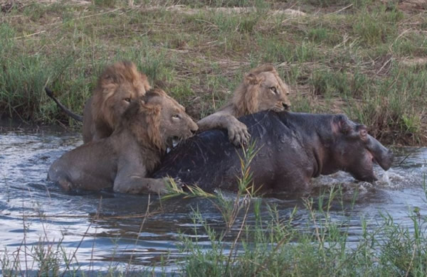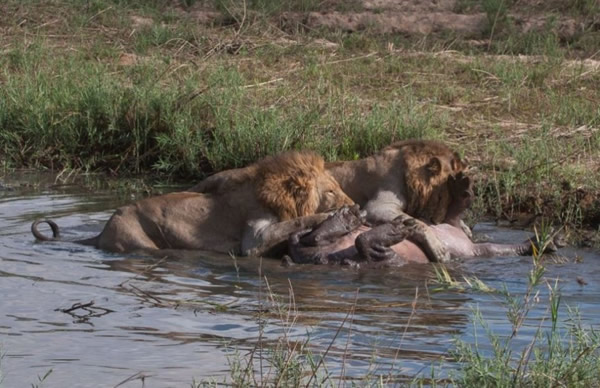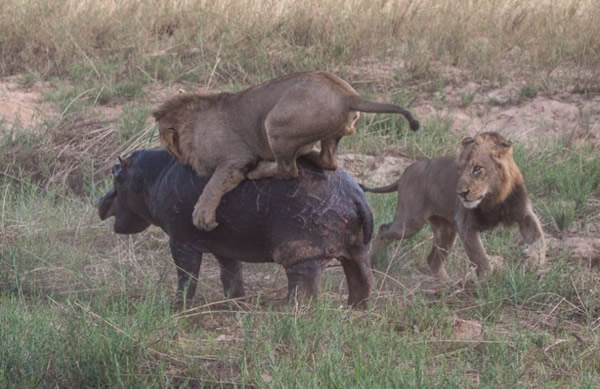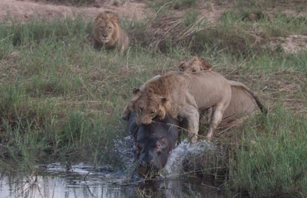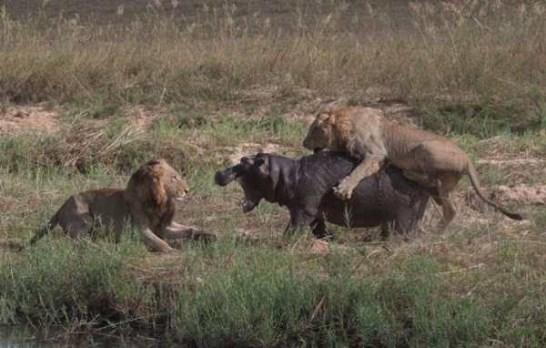 三头狮子用利爪攻击受伤的河马,这次它未能逃脱。斯克曼说:“河马跑进水中,途中狮子依然留在它身上。但这里的水比第一个水塘浅多了,狮子能站起来。它们紧紧抓住不放,试图将河马翻过来。最后,狮子成功了,河马四脚朝天。没过多久,它就不动了,狮子开始大吃起来。”