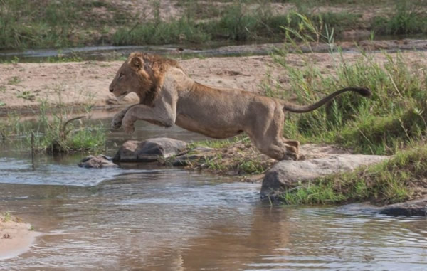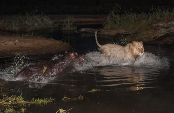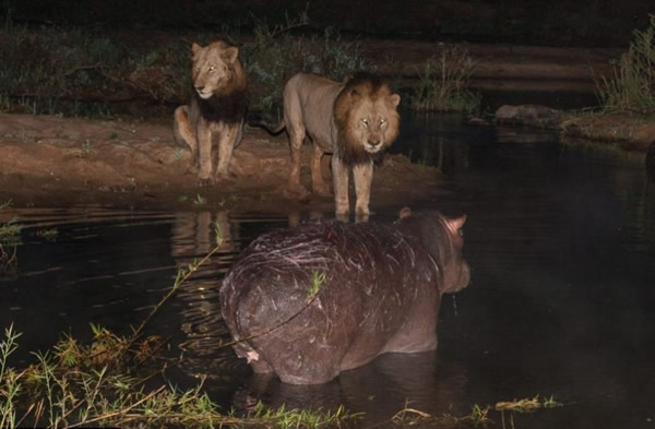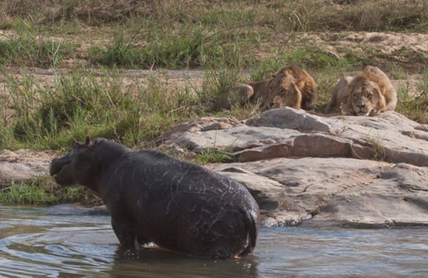 其中一头狮子冒险进入萨比滩野生动物保护区的水塘中,却被河马赶跑。