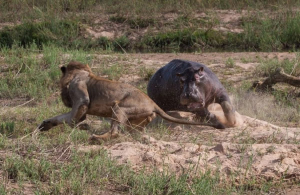 河马被迫离开水塘避难所,回到干燥的陆地上来,遭到一头凶残狮子的猛烈攻击。