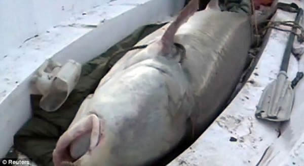 中国渔民在黑龙江捉到一条超过半吨的巨大鲟鱼