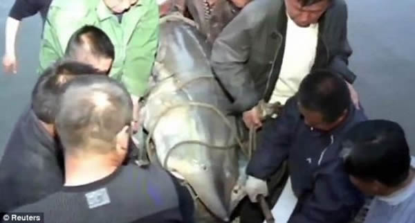 中国渔民陈林捕到这条巨型鲟鱼,但靠他一人之力根本无法搬动它,于是找了11个朋友帮忙。他们齐心协力,把这条大鱼移到一个担架上,然后将它运上岸。这条鱼重617公斤,是15日在俄罗斯边境处的中国东北部城市同江市附近黑龙江流域被捉到的。