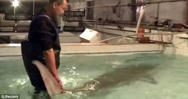 一名饲养员进到水中,紧挨在这条怀有120万个卵的卡卢加鲟鱼旁边。为了增加这种濒危物种的数量,他们会对这些鱼卵人工受精,然后将鱼苗放回黑龙江。