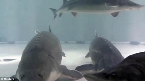 饲养中心的鱼在自由遨游。这条庞大的卡卢加鲟鱼也在其中。