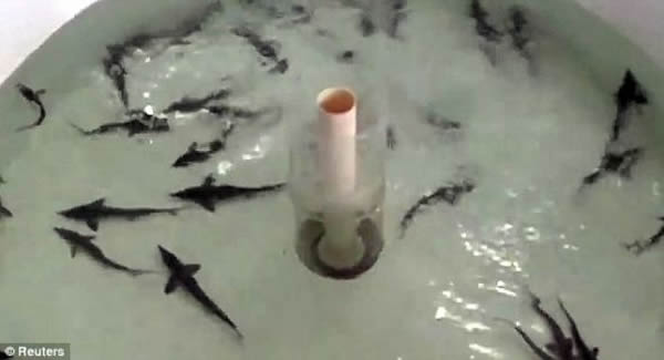 巨型卡卢加鲟鱼的卵被孵化后,像这些小鱼一样的鱼苗就会被放回黑龙江。