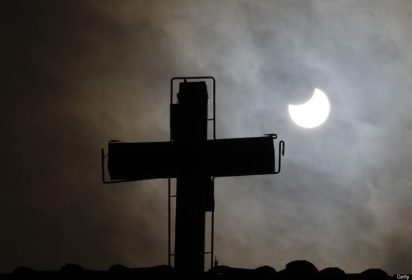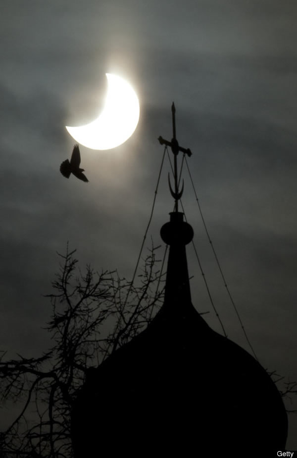 观察日全食的宽度范围最大可达到167英里宽。这张照片拍摄于2011年1月4日俄罗斯莫斯科的东正教大教堂。