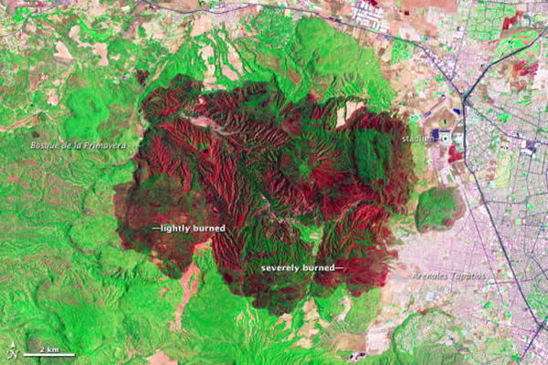 美国宇航局地球观测站今日公布了一组卫星照片,展示了墨西哥瓜达拉哈拉市附近森林公园被大火烧毁之后的景象。