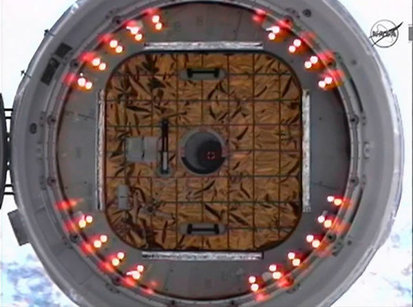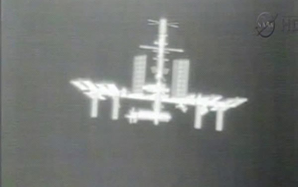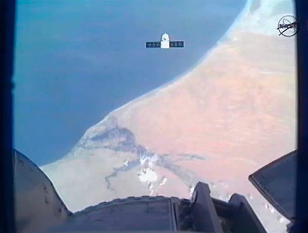 美国宇航局电视节目中截取的这张照片包含了SpaceX公司的商业飞船-龙太空舱和部分国际空间站,国际空间站的船员在完成太空舱抓取和对接以前进行最后测试的时候,此时龙太空舱待在距离空间站350米远的地方。