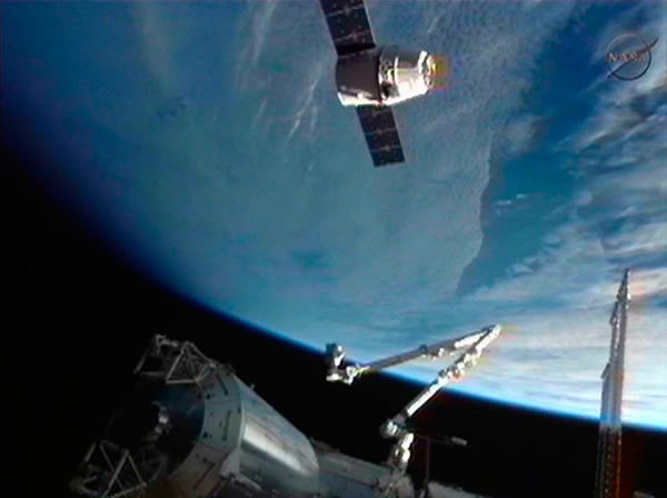SpaceX公司的商业飞船-龙太空舱被国际空间站的2号加拿大机械手臂移动到与空间站对接的位置。