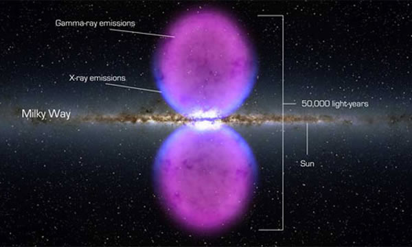 费米望远镜在2010年探测到的神秘伽马射线泡状物,这些个泡状物从银河系的中心也向外延伸27000光年左右。