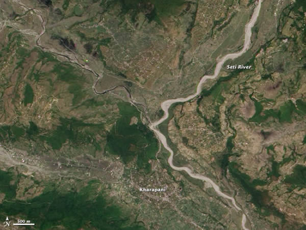 上面这幅照片是美国地球观测卫星1号(EO-1)上的先进陆地成像仪(ALI)于2012年5月20日拍摄的,显示了塞提河河道在洪水退去之后残留的泥石流。相比之下,连接塞提河与卡拉巴尼村的一条支流颜色显得更深。这条支流类似此次洪水之前的塞提河:蜿蜒于植被掩映的泛滥平原中的一条狭窄河流。