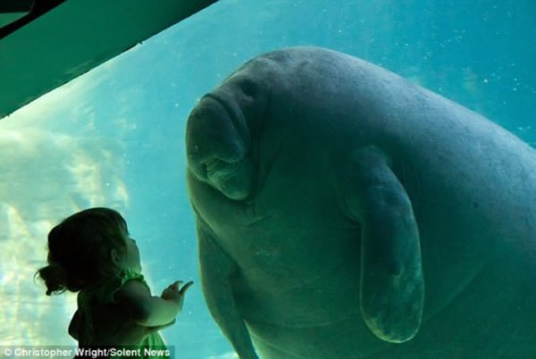 这只海牛是因触碰到轮船螺旋桨而受伤,被动物保护人员送到该海洋世界公园疗伤。一名小女孩不断地用手触摸着玻璃,希望能离水中的海牛更加亲近一点,海牛在享受水中的暖意之时,也不断向小女孩靠近。