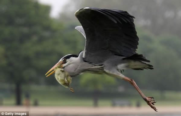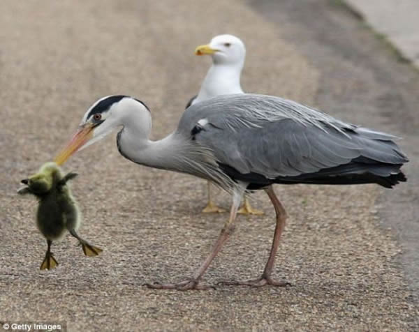 这只毛茸茸的小鹅在伦敦海德公园九曲湖游泳时,苍鹭迅速来到它身后。这个捕食者用锋利的长嘴紧紧咬住这只黄色小鹅的脖子时,它就没有生存希望了。苍鹭用橙色鸟嘴叼起小鹅,飞离九曲湖,途中牢牢咬住这只幼鸟。着陆后,它把小鹅放在干燥地面上,准备开吃。旁边有只羡慕的海鸥用不怀好意的目光注视着苍鹭的猎物。