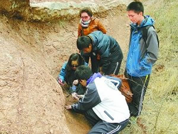 在莱阳野外仔细观察恐龙蛋窝的原始埋藏状态