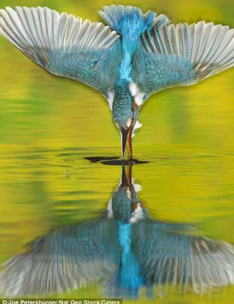 它以最快速度将翅膀折叠起来,头部朝下冲入水中,像导弹一样迅速地冲入自己的猎物。尽管这是很难进行拍摄的过程,但是摄影技术精湛的摄影师乔-彼得斯伯格非常幸运连贯地拍摄到这只捕猎翠鸟。