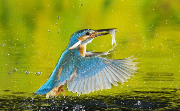 翠鸟成功地从水中捕捉到一条鱼,据称,翠鸟每天至少要吞食60%体重的食物