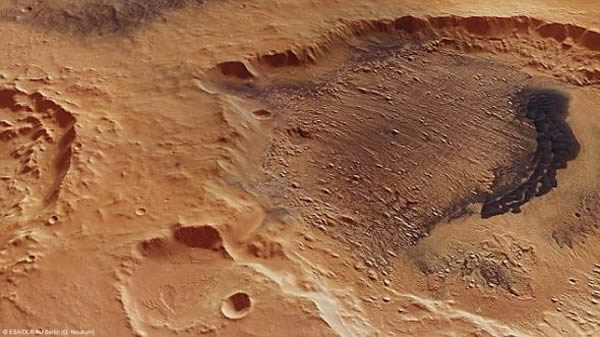 一个陨石坑显示了沉积物的黑色痕迹。科学家认为,这些沉积物先是受到一个古老地下水库的水的浸泡,然后遭到火星强风的侵蚀。