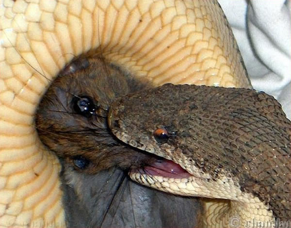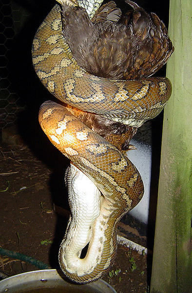 我们获得了一张惊人照片,一只地毯蛇正在吞食一只大个头的鸡。地毯蛇体长大约有2米长。这条蛇倒挂在那里,它会吞下整只鸡,注意一下它如何先吞下猎物的头部,正如所有的蟒蛇所做的一样。