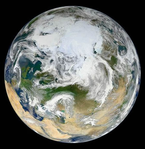 这张照片对于一些读者而言看上去可能会稍显陌生,这确实我们所在的地球,但是却并非我们常见的“蓝色玻璃球”模样。这是因为这张照片是从北极上空拍摄的,从这个角度看下去你可以目睹大片被白雪和冰盖覆盖的区域。