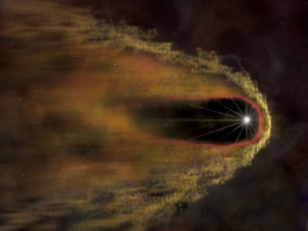 “黑寡妇”脉冲星正以每小时百万公里的速度在银河系中运行。由于它的高速运动,在它的前方激起了一个“弓形激波”。