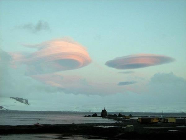 即使是南极洲也不免遭受外星入侵,这两片酷似UFO的荚状云似乎马上就要在亨克利基地着陆