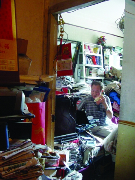 14日15时许,记者来到陈功富位于哈市三益街18号的住宅,40多平方米的屋内堆满了报刊、书籍、研究资料和杂物,客厅里只留出不足半米的过道,陈功富房间的窗户也基本被挡上了。就连床上也只有单人凉席大的地方供陈功富休息,床上还摆放着一张小桌子,桌子上有两台笔记本电脑和各种资料。在床的对面有一把椅子是唯一可以容纳第二个人的地方,陈功富示意记者坐在那里。由于杂物太多,堆放时间又很长,房间里散发着一股霉味。对此,陈功富表示:“这里有我多年来的研究资料和论文手稿,都是不能扔的。”