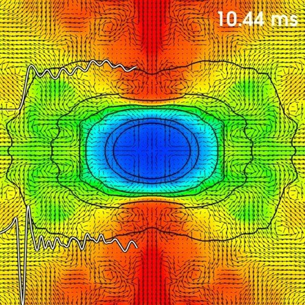 每个世纪,我们银河系中都会出现两次左右的超新星爆发事件,恒星在末年时期的死亡爆炸可向宇宙空间中释放大量的中微子流,这是一个不带电的基本粒子,并且使得周围时空产生涟漪,也就是神秘的引力波。科学家通过一个最新恒星演化模型模拟了一颗恒星末年在演化成中子星的路径上,内部区域发生坍缩的1.5毫秒时刻情景。