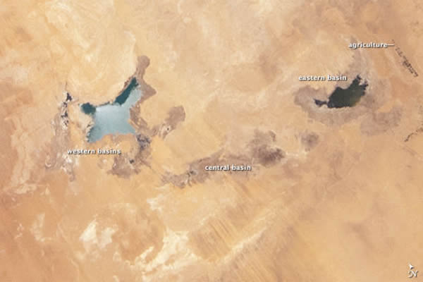 20世纪80年代和90年代,埃及建造了一条人工湖,将埃及纳赛尔湖湖水(Lake Nasser)引向撒哈拉大沙漠,托西卡湖区由此出现。托西卡湖区最大表面面积约为1450平方公里(约252.6亿立方米水体),包括4个主要湖泊(图二)。到2006年,托西卡湖区蓄水量减少了50%。 2012年6月(图一),托西卡湖区表面面积只剩下307平方千米,比2002年减少约80%,湖水撤退至湖区西部和东部低处,中部盆地已经干涸。