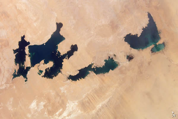 美国宇航局地球观测站今日公布了一组宇航照片,展示了埃及南部托西卡湖区(Toshka Lake)的景象。