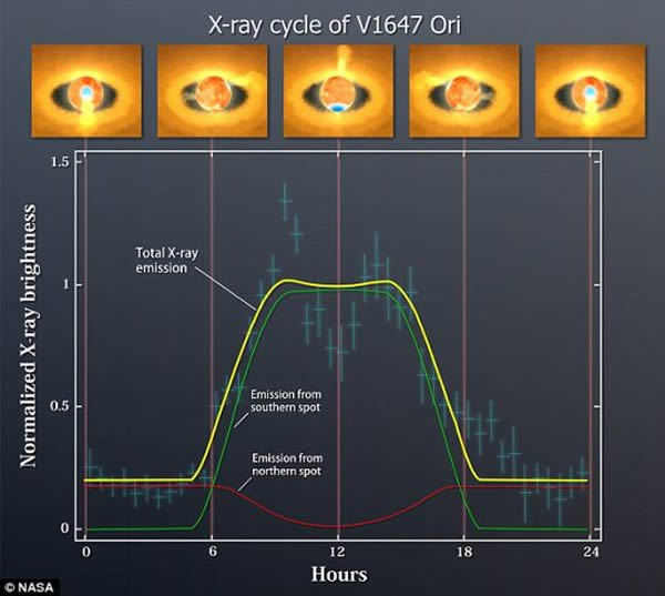 这项研究负责人之一乔尔-卡斯特纳表示:“考虑到猎户座V1647星比太阳大约5倍,快速旋转证实了我们正在观察一颗年幼恒星将它自己拉到一起的过程。”X射线的周期性变化表示这颗恒星热区外貌的变化和消失。