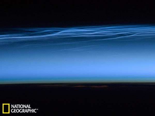 这张照片拍摄于6月13日,是国际空间站上的宇航员拍摄的作品。从这个角度看上去,蓝色的夜光云构成了一道边界,将漆黑一片的太空隔离开来。夜光云同样出现在南半球的天空中,但是它们被拍摄的比较少,这是由于在南半球高纬度生活的居民数量要少得多的缘故。