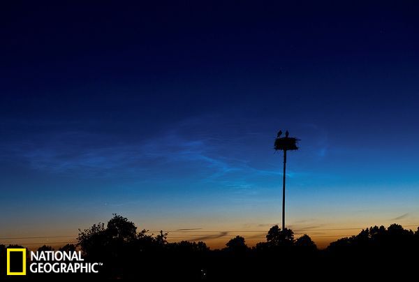 波兰祖宾镇(Szubin)上空的夜光云,还有一对筑巢的鹳,照片拍摄于6月17日。在夜光云形成的高度上,空气的密度不及地面的1/100,温度也低至华氏零下200度(约合摄氏-130度)。