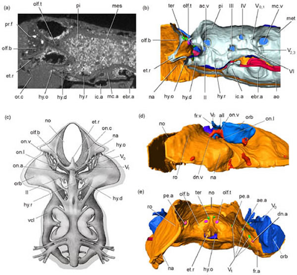 盔甲鱼类是4.35-3.70亿年前“甲胄鱼类”最为繁盛的类群之一,目前已经建立起亚纲一级的分类单元,但仅发现于中国和越南北部的志留系和泥盆系。研究人员应用同步辐射X射线断层扫描和计算机三维虚拟复原技术,发现盔甲鱼类的成对鼻囊位于口鼻腔两侧, 而垂体管向前开向口鼻腔中部, 三者完全分开。这一结果跟圆口类和骨甲鱼类头顶中央的鼻垂体复合体完全不同,而跟有颌类非常的相似。 因此, 盔甲鱼类很可能已经具备了目前发育模型所认为的颌发育所必需的先决条件之一。