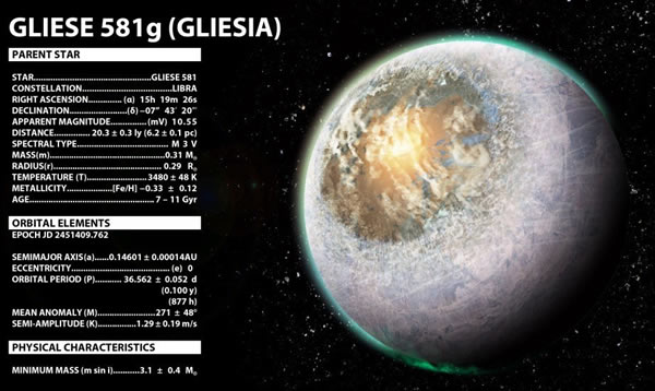 Gliese 581g星球各项轨道参数与想象图,与地球极为相似