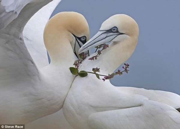 这两只爱情鸟在约8000对塘鹅中找到对方。这些动物每年都会回到这个英国皇家鸟类保护协会自然保护区。这些漂亮的生灵常用草、花甚至少量绳子和垃圾装饰它们的窝。有人拍到这对塘鹅柔情款款地拥在一起,雌塘鹅还炫耀着脖子上的红石竹项链。