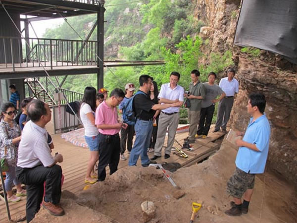 2012年7月28日上午,国家自然科学基金委地学部常务副主任柴育成在中国科学院古脊椎动物与古人类研究所所长周忠和与中国科学院地质与地球物理研究所研究员郭正堂的陪同下考察了周口店第一地点西剖面清理发掘考古现场。