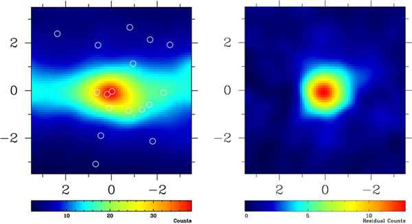 Abazajian和Kaplinghat表示,400多位与费米人造卫星一道工作的研究人员或许已经找到了证据。这两位理论学家分析了采集自2008年8月至2012年6月的数据,并聚焦于银河系中央附近的一块7度乘以7度的天空。相对于每4个能量量程,研究人员绘制了跨越这块天空的辐射情况。他们将每个地图负载于由费米人造卫星在这一区域发现的包括17个点状伽马射线源的“基准模型”,一个源自银河系中心普通辐射的“弥散”背景,和一个空间统一的背景之上。