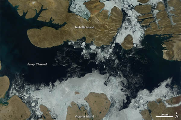 美国宇航局Terra卫星分别于2012年7月17日(上)和8月3日(下)拍下了上面这两幅照片,显示了帕里海峡海冰在两个多星期里发生的显著变化。这两幅照片显示,7月17日,帕里海峡中布满海冰,而到8月3日,帕里海峡中只有维多利亚岛和梅尔维尔岛岸边还有海冰存留,其他地方则成为无冰水面。