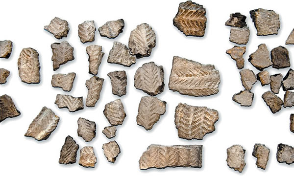 以H92和M45等单位为代表,包括部分探方的第三层。陶器以夹炭的黄褐或灰褐陶为主,胎芯为黑色,断茬处可见与器壁平行的细密的植物纤维。也有少量夹蚌或既夹蚌又夹炭的黄褐或灰褐陶。陶胎很厚(器壁厚度多在1—1.5厘米之间,底部更厚),火候很低,陶质极酥,器表色泽不均。有泥圈套接法制作痕迹,表皮多见脱落现象。器表普遍施纹,纹饰多见戳压的横向或斜向平行栉齿纹,齿痕呈楔形、圆形或窄条形,疏密不一,印痕较深的栉齿纹在器表形成椭圆形或长条形的平行坑窝。斜向平行栉齿纹常构成人字形条带,还有极少量构成横压竖排的之字纹。由于陶片极碎,难以拼对,能看出器形的标本很少。从保存较大的陶片看,器形有曲腹罐和缽等,以直口为多,圆唇。