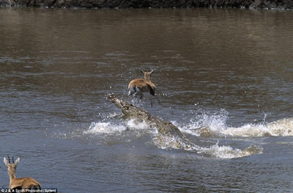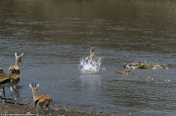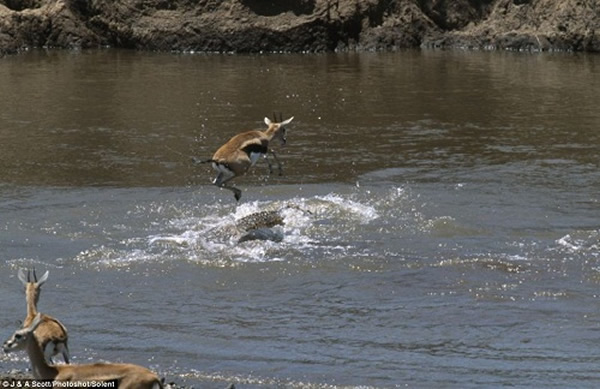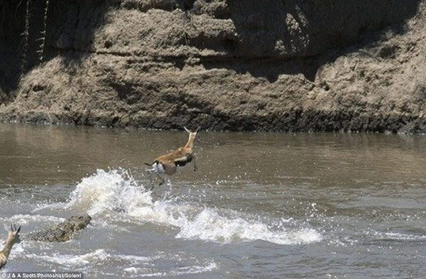 两位野生动物摄影师乔纳森和斯科特(Jonathan and Angela Scott)在肯尼亚马拉河岸边拍到这一幕。当时,有一群瞪羚正在岸边准备涉水过河,而水中是十几只等着捕食的鳄鱼。一只小瞪羚可能是昏了头,竟然径直往鳄鱼的方向奔去。两只近5米长、重约1吨的鳄鱼正在等着送到口中的美餐。不过,幸好这只瞪羚动作敏捷,鳄鱼刚开始张口撕咬,它就在鳄鱼头上连蹦带踹,跑到了一边,虎口脱险。