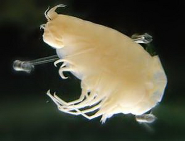 短脚双眼钩虾并不大,体长在2-5厘米之间,身体呈灰白色,接近于漂白色,它们具有一种奇特的习性——以椰子壳等木质为食