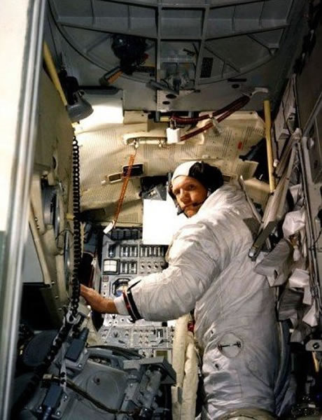 在阿姆斯特朗成功踏上月球表面后,奥尔德林也在二十分钟后踏上月球表面,两位宇航员开始对月球静海区域的岩石和粉状质地表面进行收集样本,这项任务一共花费了近21个小时,阿姆斯特朗对月球表面神奇的地貌感到不可思议,收集样本后将其带回地球。图中显示了美国国家航空航天局宇航员阿姆斯特朗在阿波罗11号宇宙飞船模拟器上进行训练的情景,地点位于佛罗里达州肯尼迪航天中心阿波罗计划宇航员训练楼中。